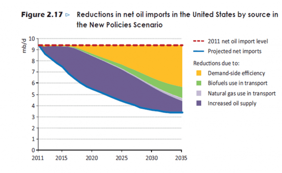 Noe av det absolutt viktigste trendskiftet i det globale energibildet de siste årene er knyttet til den økte gass- og oljeproduksjonen i USA. USA vil om få år kunne være uavhengig av oljeimport, mens Kina blir den største importøren. Oljeforbruket i OECD er ventet å falle, uavhengig av scenario. Denne grafen viser hvordan oljeforbruket i USA er ventet å utvikle seg fremover, i new policies-scenariet. Den viktigste driveren for redusert oljeimport er effektivitetsgevinster, ikke USAs egen produksjon.