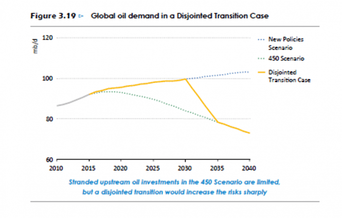 Se grafen under. De stiplede strekene viser etterspørselsbanene i New Policy Scenarioet og i tograderscenarioet (450-scenarioet), mens den gule streken viser det IEA kaller "Disjointed Transition Case", en "uordnet" overgang.