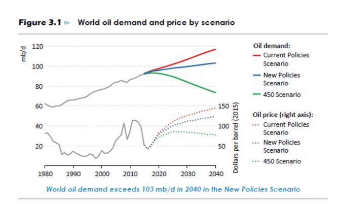 Den følgende grafen viser etterspørsel og oljepris i tre IEA-scenarioer: Gapet mellom den blå (New Policy Scenario) og den grønne (tograderscenariet) er den interessante. Den viser hvordan all olje blir mindre verdt hvis klimapolitikken lykkes.