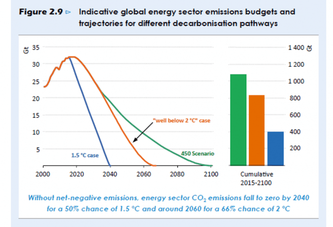 Se også grafen under. Den viser forskjellen på ulike karbonbudsjetter: 1,5 grad – og 2 grader med henholdsvis 66% og 50% sjanse til å oppfylles.