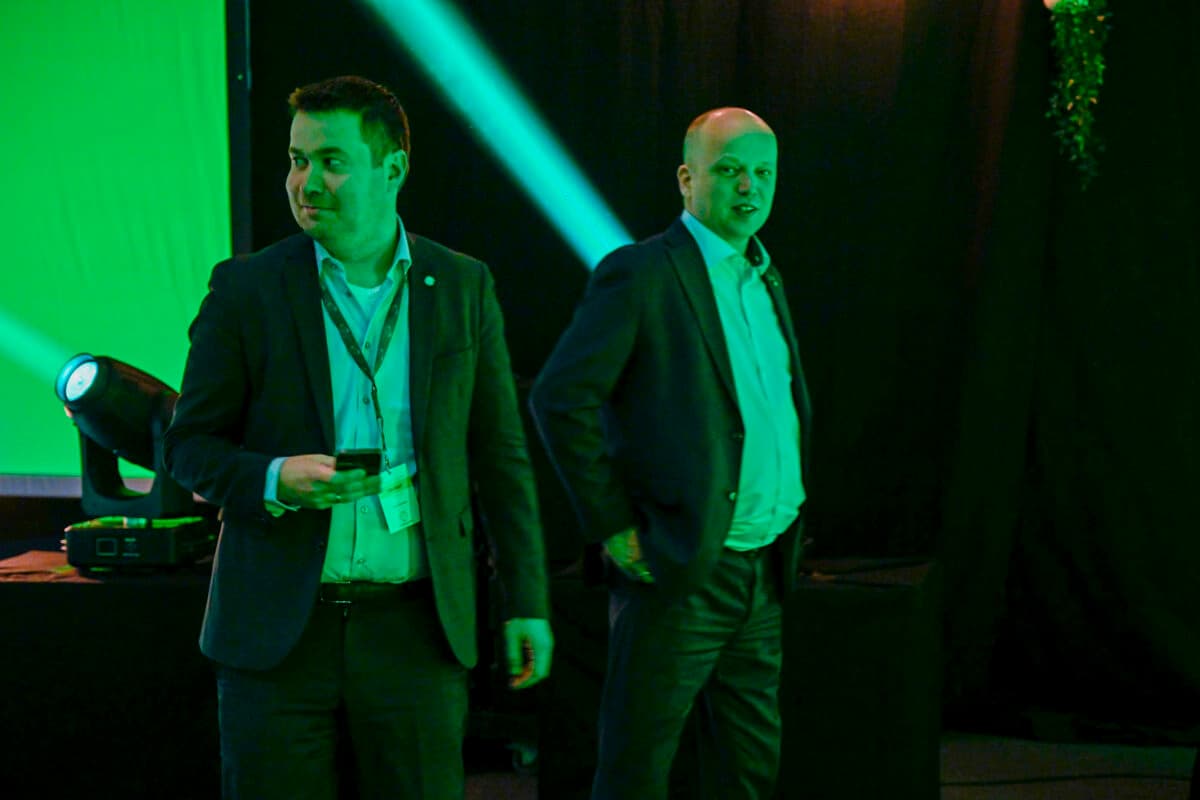 Landbruksminister Geir Pollestad og partileder og finansminister Trygve Slagsvold Vedum på Senterpartiets landsmøte i Trondheim i 2023. (Foto: Joakim Halvorsen / NTB.)