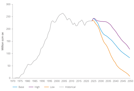 Sammen med f.eks. gass som råvare til industrien (gass som brukes i den industrielle prosessen og ikke som energi) virker derfor et forbruk i underkant av 100bcm i 2050 som et rimelig anslag. Dette er i samme størrelsesorden som den totale norske olje- og gassproduksjonen i Base-scenariet i Sokkeldirektoratets Ressursrapport fra 2024, se figur 3.