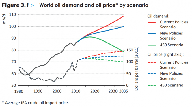 IEAs World Energy Outlook er et dokument som er pakket med informasjon om energi- og klimaspørsmål. Det viktigste budskapet i 2012-utgaven er at klimatrusselen bare kan møtes om to-tredeler av de allerede påviste fossile energireservene blir liggende der de er. Oversatt til en annen språkdrakt: Store deler av kull-, olje-, og gassressursene som er i staters og selskapers besittelse har ingen kommersiell verdi dersom den globale oppvarmingen begrenses til det omforente togradersmålet verdens ledere – herunder Jens Stoltenberg – ved gjentatte anledninger har bekjent seg til.