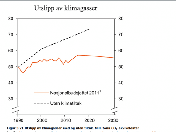 I Nasjonalbudsjettet for 2013 viser finansminister Sigbjørn Johnsen frem en graf som fortjener stor politisk oppmerksomhet. En fremskrivning mot 2030 viser at Norges klimautslipp vil være høyere om 18 år enn i dag. Se på den røde streken.
