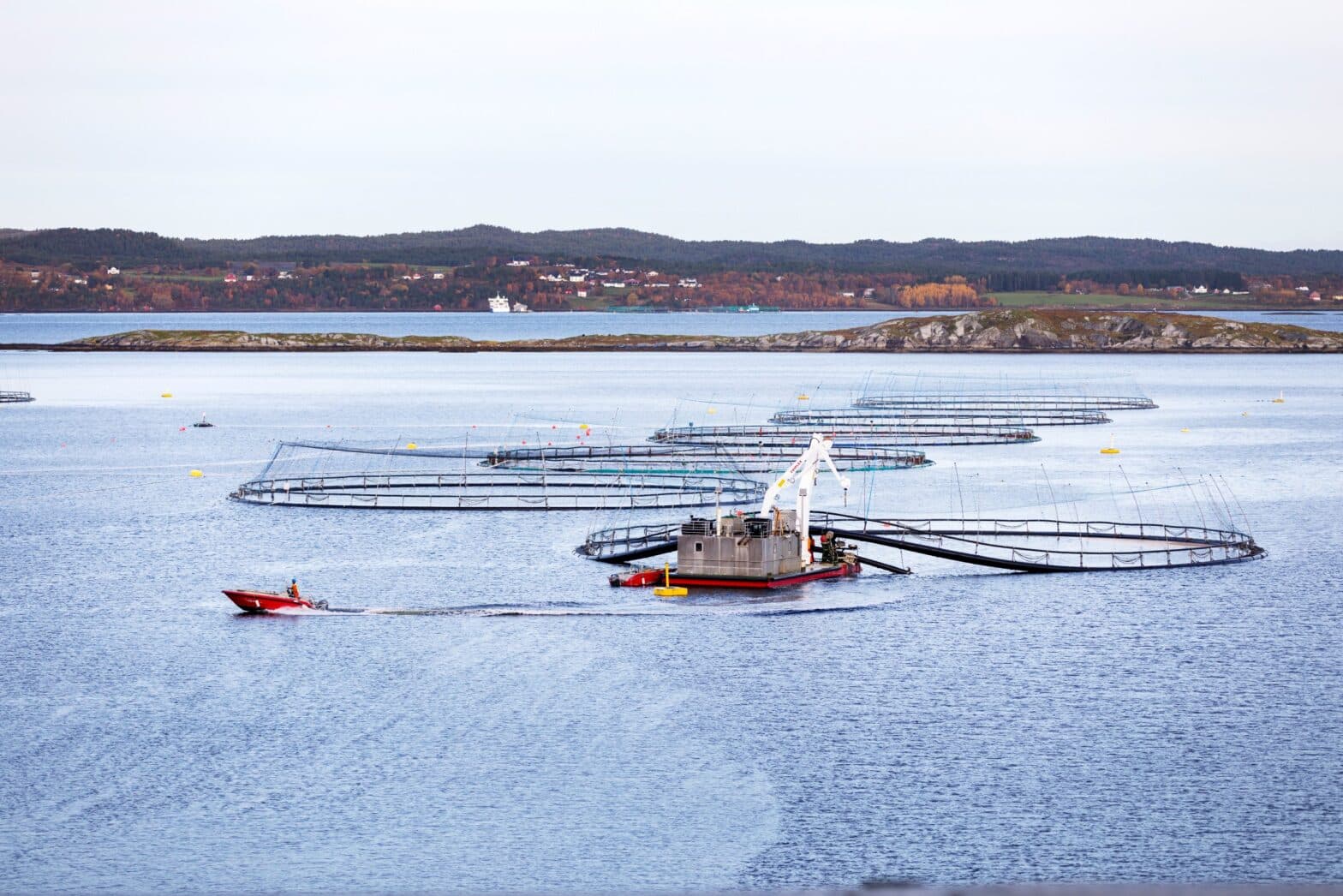 Sjømatbedrifter i distriktene mangler tilgang på fornybar kraft, skriver artikkelforfatteren. Her et anlegg for lakseoppdrett med spesialbåter for fiskeoppdrett utenfor Hitra, på trøndelagskysten. Foto: Gorm Kallestad / NTB