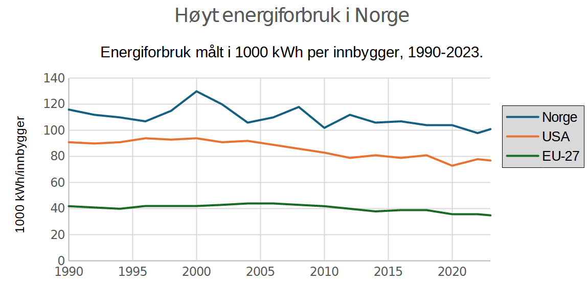 Det er vist i figuren under hvordan energiforbruket per innbygger i Norge og i hele EU-området (EU-27) siden 1990 ser ut når det er beregnet på denne måten. Utviklingen i USA er også tatt med. I 2023 var forbruket i Norge om lag 101 000 kWh oljeekvivalenter per innbygger. Det var nær tre ganger høyere enn i alle EU-landene samlet (EU-27) hvor det var på snaue 35 000 kWh. Det var også betydelig høyere enn forbruket i USA hvor det var på 77 000 kWh per innbygger i 2023.
