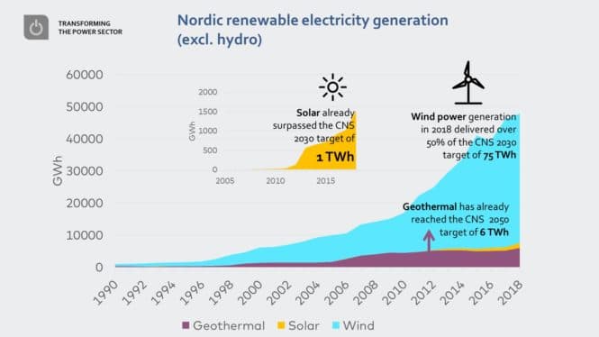 For noen sektorer går et år eller to på et øyeblikk, og rapporten viser at endringene i for eksempel industri går sakte. Det er et helt annet bilde når man ser på fornybar energi. Nordisk vind- og solproduksjonskapasitet økte fra 16,6 GW i 2017 til 18,8 GW i 2018. En enorm økning på 13 prosent over et år, noe som gir en produksjon av solstrøm på over 1 TWh (høyere enn forventet i 2030) og vindkraftproduksjon på mer enn 40 TWh (nok til å dekke hele Danmarks elforbruk). Et imponerende tall, og utviklingen vil ikke stoppe her: Med mindre den nåværende krisen forårsaker store forstyrrelser i vindforsyningskjeden, vil planlagte investeringer i Sverige alene øke den svenske vindkraftproduksjonen til omtrent 45 TWh innen 2023 (en tredjedel av svensk kraftforbruk) .