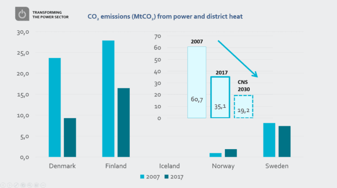 Selv om det er noen mørke skyer i horisonten, er det også lysglimt å se opp mot. I motsetning til de fire nevnte sektorene fortsetter kraft- og varmesektoren å gi betydelige utslippsreduksjoner. På bare ti år, fra 2007 til 2017, falt utslippene her fra 60,7 millioner tonn CO₂ til 35,1 millioner tonn CO₂. Og utviklingen akselererer, fra 2016 til 2018 gikk de ned med mer enn 9 prosent, i tråd med det mellomliggende 2030-målet og en indikasjon på at Norden er på vei til en fullstendig karbonnøytral elektrisitets- og varmesektor innen 2050. Drevet frem av redusert fossilt brenselsbruk (som nedleggelsen av Sveriges siste kullkraftverk to år tidligere enn planlagt) og økt produksjon av og investering i fornybar energi.