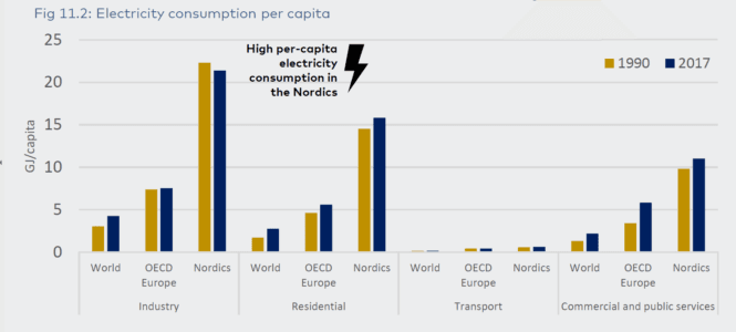 Rapporten ser også nærmere på det nordiske energisystemet sammenlignet med det europeiske og globale, og fremhever den enestående rollen til biomasse og avfall, den høye andelen fornybar energi og den store andelen CO₂-fri strøm som brukes i nordiske boliger og i industrien, sammenlignet med resten av verden.