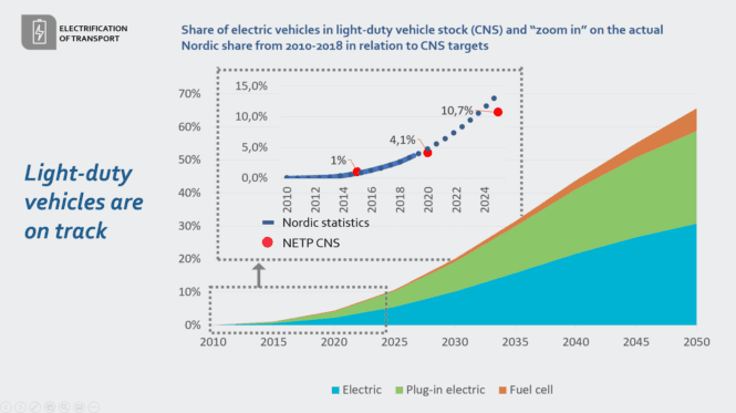 Det samme gjelder salg av elbiler (plug-in hybrider (PHEV) og batterielektriske biler (BEV)). Med nesten en halv million elbiler på de nordiske veiene, og med en rekordhøy andel av nybilsalget i 2019, vil elbiler sannsynligvis overgå forventningene, noe som gir håp om at deler av transportsektoren allerede kan levere kraftige reduksjoner i utslipp i nærmeste fremtid. Samtidig ser man at koronaepidemien slår hardt ut på det globale elbilsalget i 2020, med et fall på 17 prosent. Lyspunktet (for klima) her er at salget av fossilbiler faller enda mer.