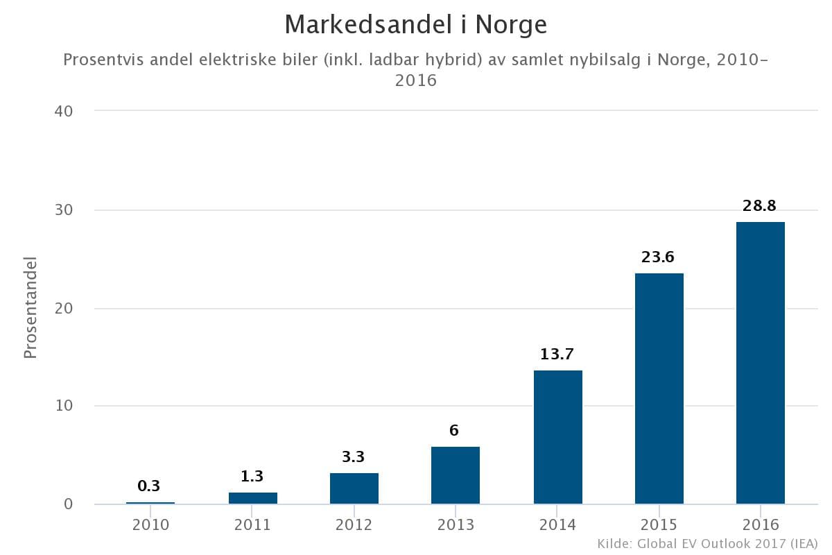 Bekmørkt er det likevel ikke i norsk klimapolitikk. Selv om vi ikke kan se det på utslippsstatistikken, er omstillingen i transportsektoren kommet godt i gang. For syv år siden stod elektriske biler for 0,3 prosent av det samlede nybilsalget i Norge. Seks år senere – i 2016 – var tallet økt til 29 prosent. I august 2017 gikk 40 prosent av alle solgte nybiler i Norge helt eller delvis på strøm. Vi viser verden at det går an å elektrifisere transportsektoren raskt.