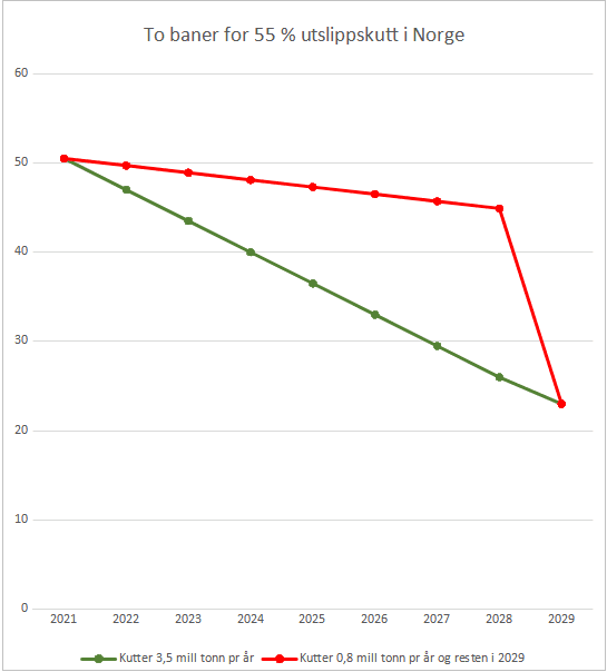 Hvis vi legger inn Nasjonalbudsjettets framskrivning (tabell 3.14) på 0,8 millioner tonn utslippskutt pr år til og med 2028, og så resten av de 55 prosent kutt i 2029, da får vi den røde linjen. Den røde linjen gir et samlet kutt på 50 millioner tonn. Hvis Norge gjør sin andel av 1,5-gradersmålet – på ekte, da kutter vi som sagt 3,5 millioner tonn CO₂-ekvivalenter hvert eneste år (grønn linje). Det vil gi 126 millioner tonn mindre CO2 til atmosfæren, og det er 252 prosent mer enn de 50 millioner tonn som vi kutter hvis vi bare kutter 0,8 millioner tonn pr år fram til og med 2028 og så kutter derfra ned til 55 prosent i 2029 (rød linje).