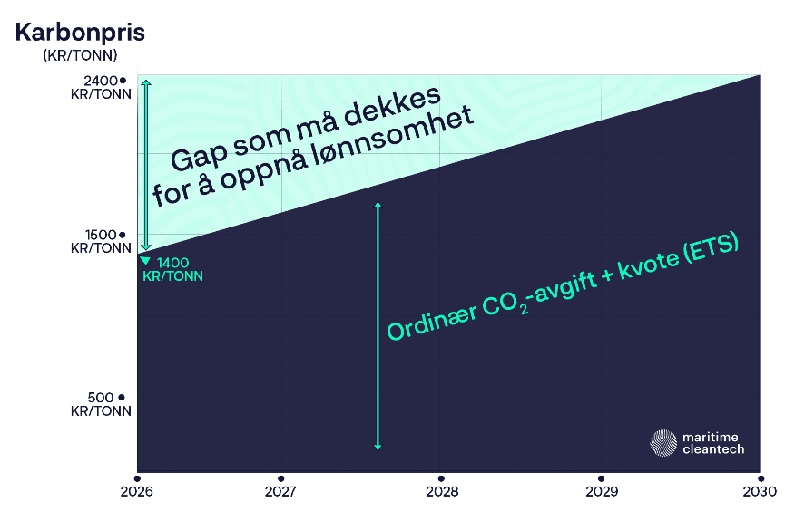 I dag betalar norske skip ca. 750 kr/tonn i nasjonal CO₂-avgift. Frå 2024 vart norsk skipsfart fasa inn i EUs kvotesystem (ETS) og må betala ein forventa gjennomsnitts kvotepris på 1500 kr/tonn i 2030. Regjeringas plan er at den samla karbonprisen (avgift + kvote) skal vere 2400 kr/tonn i 2030.