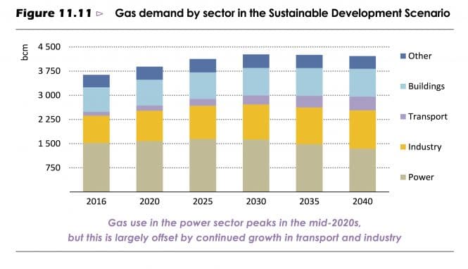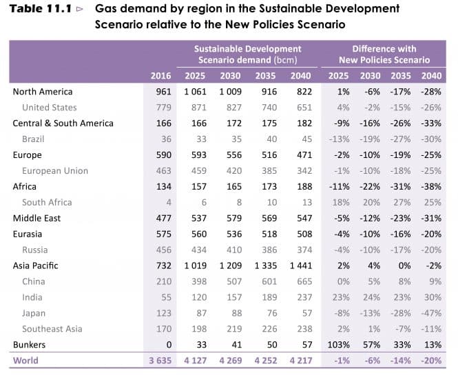 Det globale forbruket av gass veks i alle framskrivingane – frå 3635 bcm i 2016 til 5704 bcm (New Policies Scenario) eller 4217 bcm (Sustainable Development Scenario) i 2040. I sistnemnte scenario vil det skje ei utflating frå rundt 2030.