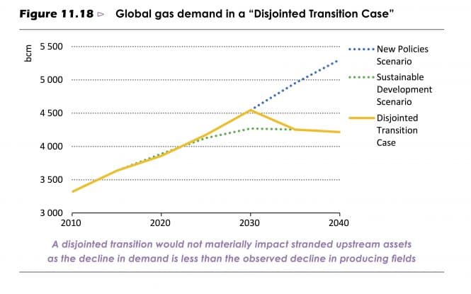 La meg derfor avslutte med det IEA kallar «a disjointed transition case» – her eksemplifisert med framtidig gass-etterspurnad. Forbruket veks bråare og lengre enn i SDS-scenarioet, for så å falle kraftig frå rundt 2030. Ei slik utvikling vil vere langt vanskelegare å handtere – ikkje minst for ein gasseksportør som skal ta store investeringsavgjersler ut frå forventa marknadsutvikling – men det er eit like sannsynleg scenario som alle andre i World Energy Outlook.