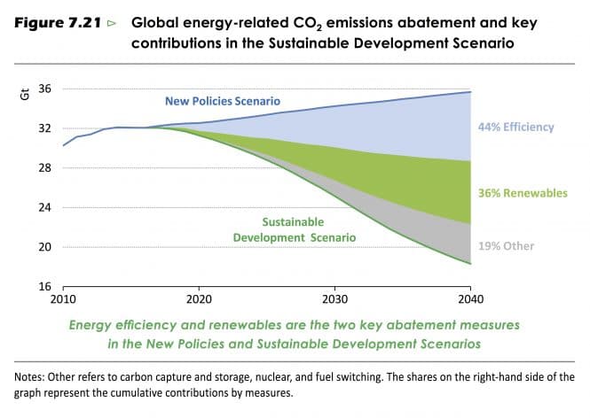 Gapet i energirelaterte CO₂-utslepp er stort mellom hovudscenarioet og SDS. I 2040 vil differansen utgjere over 17 gigatonn CO₂. Utsleppsbudsjettet i SDS er også litt strammare enn fjorårets 450-scenario.