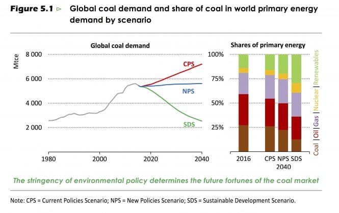 I SDS-scenarioet vil kolforbruket reduserast kraftig fram mot 2040: først ned til 4318 Mtce i 2025, for så å krympe vidare til 2539 Mtce i 2040. Det er i kraftmarknaden endringane er størst. I 2016 gjekk 63 prosent av kolet til kraftproduksjon (3320 Mtce), i SDS-scenarioet vil 33 prosent av kolet gå til dette formålet i 2040 (826 Mtce). Utviklinga her er den same som i 450-scenarioet frå i fjor.