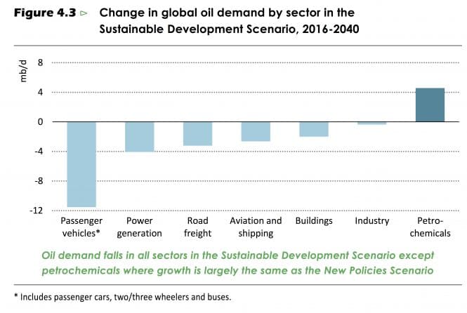 Verdas oljekonsum i 2016 er estimert til 93,9 millionar fat per dag (mb/d). I SDS vil oljeforbruket nå ein topp på ca. 95 mb/d rundt 2020, for deretter å falle til 72,9 mb/d i 2040. Dette er omtrent same nivå som IEA hadde i fjorårets 450-scenario (73,2 mb/d), og for spesielt interesserte: det følgjer også bana til Statoil Renewal-scenario (60 mb/d i 2050).
