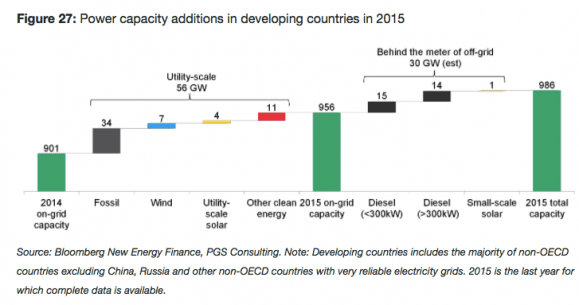 "diesel generators have long been the technology of choice in areas where reliable grid electricity is unavailable. In 2015, developing countries bought and installed about 600,000 units annually, totalling an estimated 29GW of capacity. About half of this is in units smaller than 0.3MW. There is a mature market and supply chain to sell, fuel and maintain this kit. Despite usually being competitive with diesel, solar currently has less than 3% of the market for distributed energy capacity in developing countries, well short of its potential".