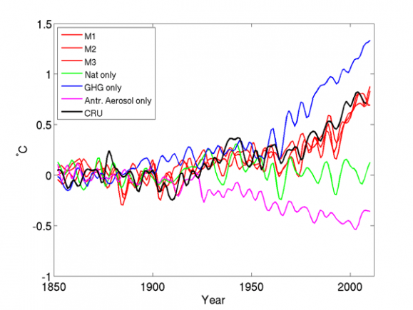 Figuren syner vidare at temperaturauken i modellen skuldast utslepp av klimagassar, vist med blå kurve. Det er desse klimagassutsleppa som gjer at temperaturen på jorda har auka, med ein særleg sterk auke sidan 1950. Klimaeffekten frå vulkanar og variasjoner i solinnstrålinga er vist med grøn farge. Sett over lang tid er det liten verknad på den globale temperaturen frå desse bidraga.