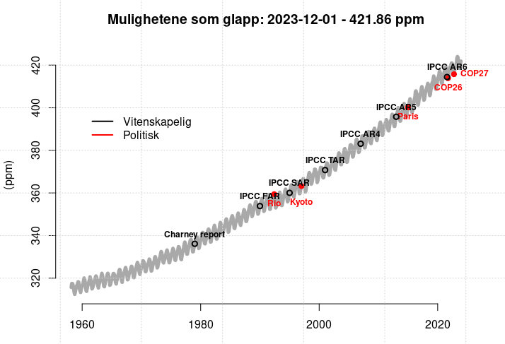 Jeg spurte panelet til frokostseminaret om hva vi har gjort galt siden Keeling-kurven (figur under), som viser konsentrasjoner av karbondioksid (CO2) i atmosfæren, har økt i økende grad etter hvert klimatoppmøte og hver klimarapport.