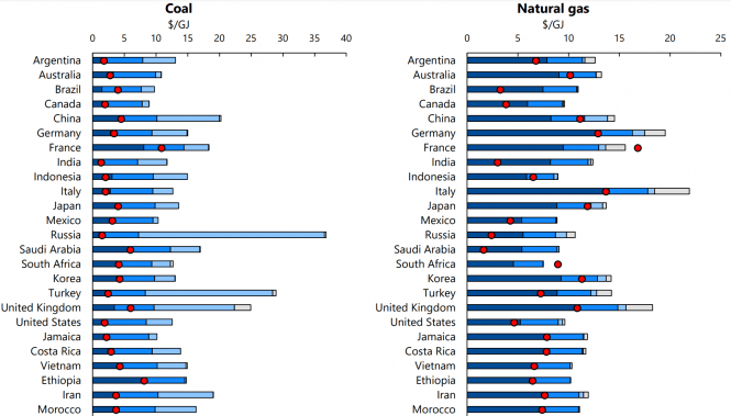 Den røde prikken viser den faktiske prisen for henholdsvis kull og gass i markedet. Den blå og grå søylen viser hva disse råstoffene burde ha kostet, altså hvis råvarekjøp, subsidier, forurensning, klimakonsekvenser og skatt var inkludert.