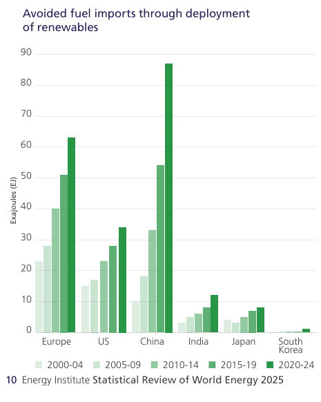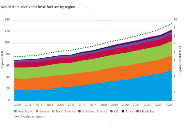 Veksten innen fornybar energi er mye raskere enn veksten i fossil energibruk. Det fossile energiforbruket – og dermed utslippene – ville vært vesentlig høyere om det ikke hadde vært bygd ut store volum sol- og vindkraft de siste årene. Dette fremheves i rapporten fra Energy Institute, som viser til at fornybar energi og kjernekraft siden 2010 har spart atmosfæren for 110 gigatonn CO₂. Dette tilsvarer omkring 2,5 ganger utslippene i 2024.