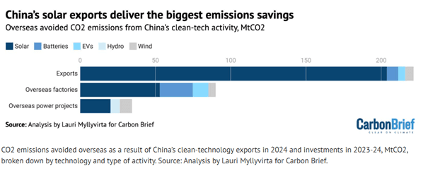 Et annet eksempel er Kinas eksport av utslippsreduserende teknologier. Ifølge en analyse gjengitt i Carbon Brief vil Kinas 2024-eksport av teknologi som solceller, elbiler og vindturbiner medføre årlige utslippsreduksjoner i andre land på 220 millioner tonn CO₂. Gjennom produktenes levetid kan eksporten dette året alene gi en utslippsreduksjon på 4 gigatonn CO₂.