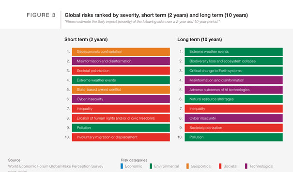 Trusler om tolltariffer fra USA og respons gjennom EUs «bazooka» viser at risikobildet på kort sikt sammenfaller veldig godt med konklusjonene i undersøkelsen Global Risk Report, som World Economic Forum har gitt ut i mange år. Den er basert på en spørreundersøkelse og intervjuer med eksperter og ledere over hele verden.