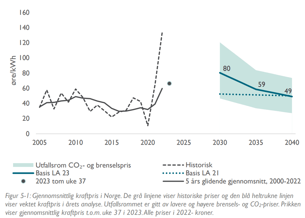 Dette er en av forklaringene på at strømmen fremover ikke kommer til å bli så rimelig som vi har vært vant med. Ny fornybar energi, og for den saks skyld også tiltak for energieffektivisering, koster betydelig mer enn de 30-40 øre/kWh som var den «gamle» normalen for kraftprisen. Dette var prisleiet før Ukraina-krigen, mens det etter Putins angrep på nabolandet har vært vesentlig høyere priser. Gassprisene er fortsatt betydelig høyere enn tidligere, selv om de har gått mye ned fra de verste toppene. I perioder med mye fornybar kraftproduksjon og lavt forbruk kan strømprisene gå svært lavt, men markedet forventer priser de nærmeste par årene på oppunder 80 øre/kWh i gjennomsnitt. NVEs prognoser indikerer et tilsvarende nivå frem mot 2030.