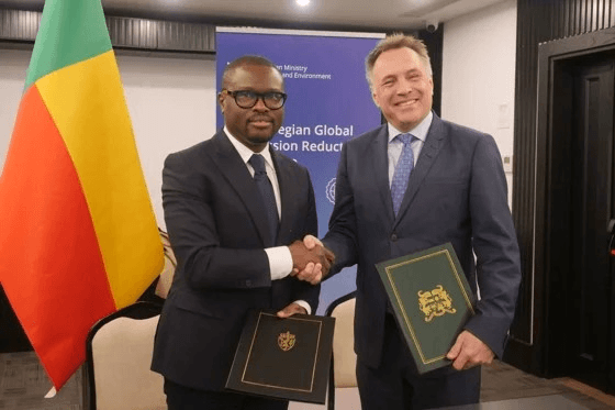 Benins økonomi- og finansminister Romuald Wadagni og klima- og miljøminister Tore O. Sandvik signerte tirsdag en avtale om kvotekjøp. (Foto: Martine Røiseland / Klima- og miljødepartementet)
