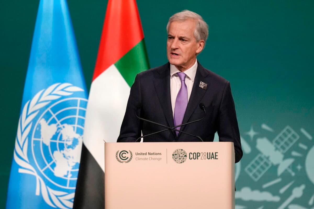 Statsminister Jonas Gahr Støre vil ikke rokke ved noen ting i Norges oljepolitikk. Her snakker han under COP28 i Dubai. (Foto: Rafiq Maqbool, NTB/AP)