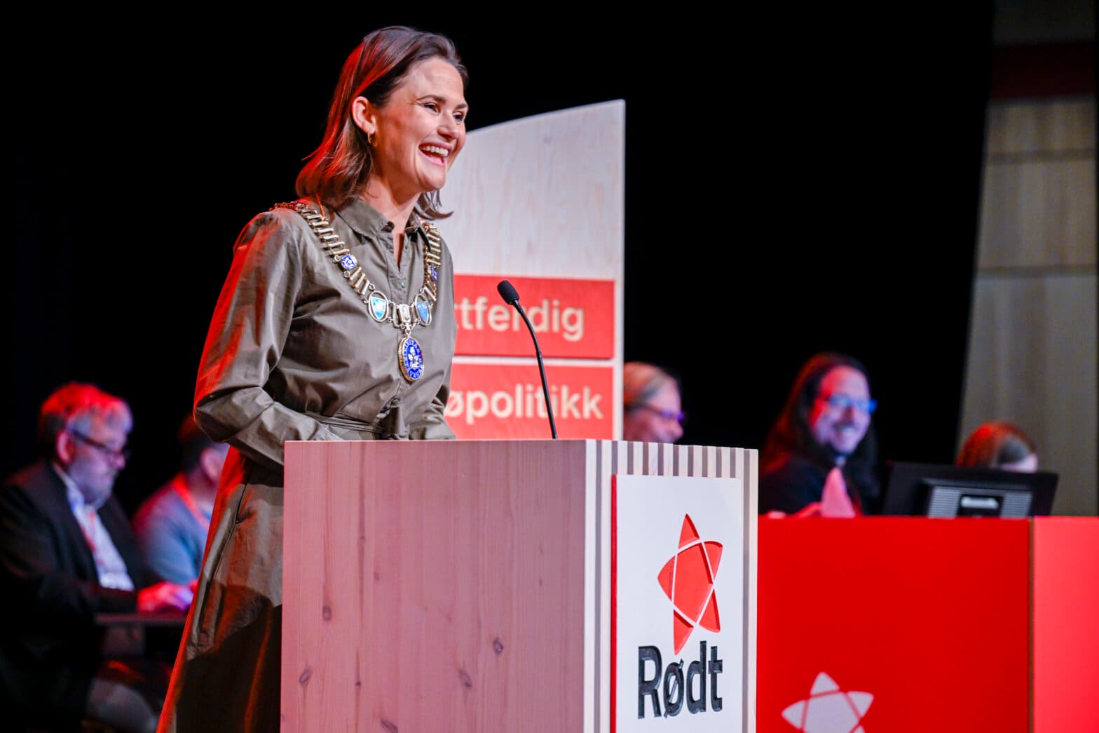 Stavanger-ordfører Kari Nessa Nordtun (Ap) leder en bred koalisjon som nå vil gi gratis kollektivtrafikk til alle byens innbyggere. Her taler hun på Rødts landsmøte som ble holdt i Stavanger i april. (Foto: Carina Johansen / NTB)