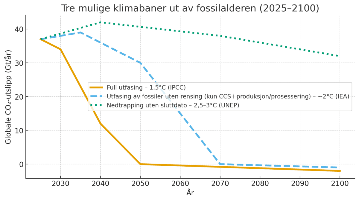 Tabellen nedenfor viser de tre alternativene med antatt temperaturendring, nødvendig fornybarproduksjon, hvem som støtter alternativene per i dag, og konsekvenser. Full utfasing innen 2050 er nødvendig for 1,5 °C. Unabated-banen krever massiv CCS, men kan redusere oppvarmingen til ~2°C. Nedtrapping uten sluttdato peker mot ~3°C og alvorlige irreversible konsekvense