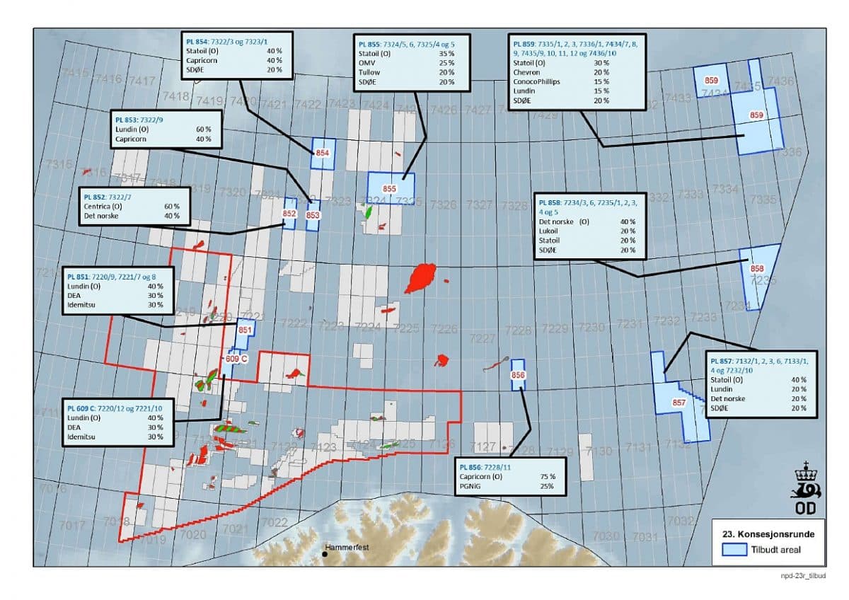 Kart over de tildelte letearealene i 23. konsesjonsrunde (kilde: Olje- og energidepartementet).