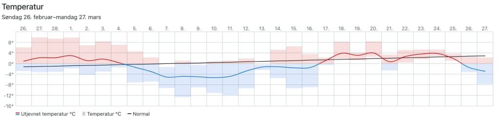Bildet under er en skjermdump fra ECMWF sin oversikt over prognoser som dekker de kommende ukene. Neste uke ligger hele landet vårt i et område der det antas å bli kaldere enn normalt. Det samme gjelder frem til midten av april, men etter det blir det mer usikkert. Klikk på bildet for å komme inn på siden, hvor du kan navigere fremover og bakover i tid, men vit at usikkerheten øker kraftig jo lengre frem varslene går.