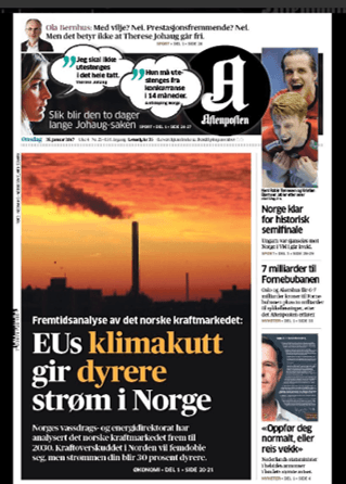 Forsidenpå Aftenposten 25. januar 2017 forteller oss at en mer offensiv klimapolitikk i Europa fører til høyere strømpris i Norge og at kraftkabler har skylden. Det de ikke tar med er: