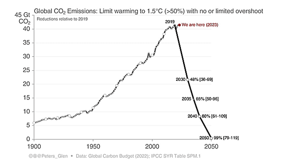 Vi vil høre at de fleste statslederne støtter Paris-avtalen, selv om de vet at den ikke er oppnåelig. Om noen er i tvil, se på figuren under fra Glen Peters, forsker ved CICERO. Det mest skremmende er at kurven for å stanse oppvarmingen på to grader, er nesten like bratt, og at planene til de 20 største utslippslandene gir større og ikke mindre utslipp i 2030 enn nå.