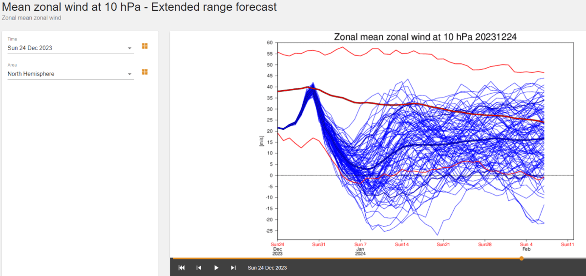 Som jeg skrev om i forrige innlegg, knyttes det spenning til om den polare virvelen i stratosfæren kommer til å svekkes så mye at det vil påvirke oss på bakken. Som bildet under viser, er virvelen allerede svak, og de fleste prognosene antyder fremdeles et midlertidig oppsving fulgt av en kraftig svekkelse fra nyttårsaften (klikk og last inn siden på nytt for å se oppdaterte prognoser):