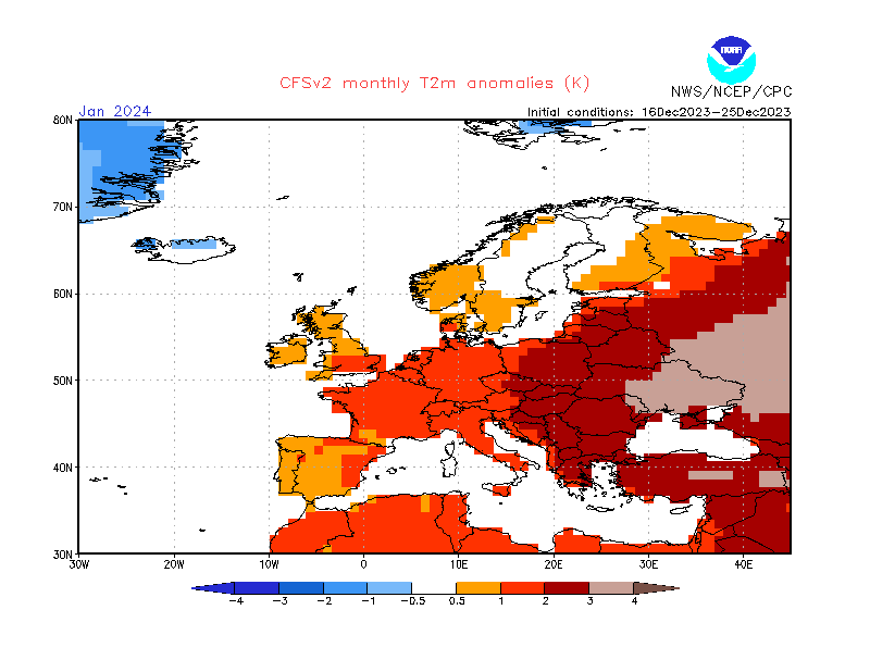 En annen modell, den amerikanske sesongvarslingsmodellen, brukes til å lage fire prognoser hver dag, der hver av prognosene går flere måneder frem i tid. Her er deres nyeste prognose for hele januar under ett, også vist som gjennomsnittlig avvik fra normalen (klikk på bildet for å se oppdaterte prognoser eller her for flere valg):