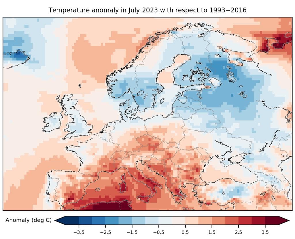 Kartet under viser hva som virkelig skjedde i juli. De blå fargene illustrerer at det kom mange lavtrykk inn fra sørvest, og disse hadde med seg våte, kjølige luftmasser. Dette gjorde det forholdsvis kaldt i Sør-Norge og på De britiske øyer. Oslo var 1,4 grader under normalen (1991–2020), mens Bergen var 0,2 grader under. (I fjor var det motsatt; da var Oslo 0,2 grader under mens Bergen var 1,4 grader kaldere enn normalt.) Tromsø var 1,8 grader varmere enn normalt i juli 2023.
