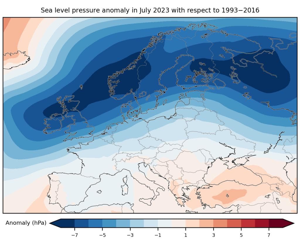 Vi meteorologer pleier å se på lufttrykket når vi skal vurdere hvorfor varsler slår feil. Kartet under viser varslet lufttrykk i juli, i form av avvik fra referanseperioden. En overvekt av modellsimuleringene hadde et høytrykk over Norskehavet i nord og et lavtrykk over Atlanteren vest for Portugal. Det er ikke usannsynlig at dette skyldtes de høye havtemperaturene under området med varslet lavtrykk, i kombinasjon med lavere havtemperaturer i Norskehavet under det varslete høytrykket. Ettersom luft beveger seg mot klokken rundt et lavtrykk og med klokken rundt et høytrykk, ville denne situasjonen ha ført til østlig (varm og tørr) vind inn over Sør-Norge og nordlig (kald) vind over Nord-Norge.