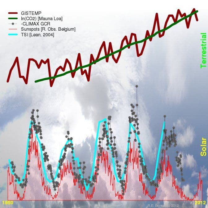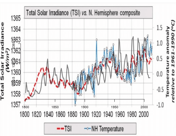 Feil. Bergsmark er skråsikker og påstår at solaktiviteten og naturlige svingninger er ansvarlig for den globale oppvarmingen. Dette er et interessant vitenskapelig spørsmål, som jeg mener at vi må ta på alvor. En av hovedkildene til Bergsmark er en artikkel av Willie Soon og flere (2015), og en figur som sammenligner en kurve som angivelig skal være solens utstråling og temperaturen på den nordlige hemisfære (se figur 4 nedenfor). Bergsmark påstår at fordi solaktiviteten ser ut til å forklare det meste av temperaturendringene, har CO₂ lite å si. Det er en misforstått logikk, fordi argumentet for CO₂ bygger på fysiske forhold, og det ene ekskluderer ikke i prinsippet det andre.