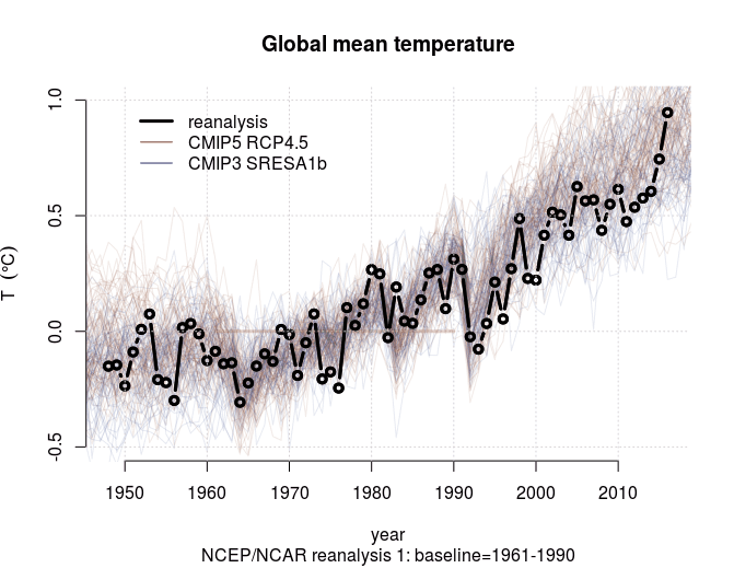 I tillegg er det en rekke andre forhold som har en betydning for langtidstrenden: hvordan man setter sammen målinger fra ulike satellitter, eksakt hvor satellittene befinner seg, elektronikken som støtter instrumentene, forstyrrende bidrag fra bakken, skyer, partikler, og høyere luftlag. Satellittmålinger gir likevel et viktig bilde av klimaet, men er uegnet som sannhetsvitne med hensyn til klimamodellene. Men hvis man går til datakildene (RSS/UAH), gir de et annet bilde enn Bergsmarks rapport – spesielt hvis man har i mente at El Niño får et større utslag på temperaturen i øvre atmosfære enn ved overflaten. Det er bedre å sammenligne mer like størrelser. Figur 3 viser en rekke ulike beregninger av den globale middeltemperaturen og det som kalles for en «reanalyse», dvs alle tilgjengelige måledata (termometere, satellitter, ballonger, osv) som er matet inn i en atmosfæremodell for å gi best mulig beskrivelse av atmosfæretilstanden. Disse tilsvarer beskrivelsen som brukes for å bestemme utgangspunktet som brukes i vanlige værvarsler.