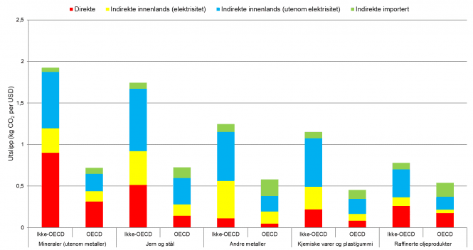 Dernest må det bestemmes om man kun skal betale for de direkte utslippene på fabrikken der varen ble produsert, eller om man også skal betale for indirekte utslipp. Sistnevnte er spesielt relevant for varer som produseres med mye bruk av elektrisitet. De fleste fabrikker henter strøm fra nettet og kan ikke kontrollere utslippene ved kraftproduksjon. Det samme gjelder for andre innsatsvarer i produksjonen. Som figuren under viser, utgjør de indirekte utslippene en stor del av det samlede karbonavtrykket for mange varer. Siden disse er vanskeligere å kontrollere, har EU foreløpig valgt å kun ta hensyn til direkte utslipp.