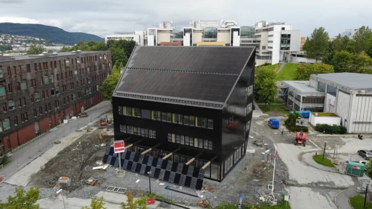 Solkraft på bygg er en enkel, konfliktfri og rimelig kilde til økt grønn kraftproduksjon. Her illustrert ved Norges kanskje mest miljøvennlige bygg, ZEB Flexible Lab på NTNU. Solkraft burde derfor vært en integrert del av regjeringens klimaplan og den kommende stortingsmeldingen «Langsiktig verdiskapning av norske energiressurser». (Foto: Solcellespesialisten)
