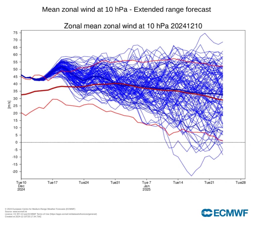 En brå stratosfærisk oppvarming forekommer dersom vindhastigheten krysser null og blir negativ. Vi ser over at dette skjer i noen få av de 100 prognosene, men ikke før tidligst 10. januar. Det vanligste er at det blir kaldt i Nord-Europa etter en stratosfærisk oppvarming, men det kan noen ganger skje at det også blir kaldt hos oss mens denne er i ferd med å utvikle seg. Uansett er det lite som tyder på en kald januar (minner som alltid om at det kan komme kortere kalde perioder selv om januar under ett blir mildere enn normalt).