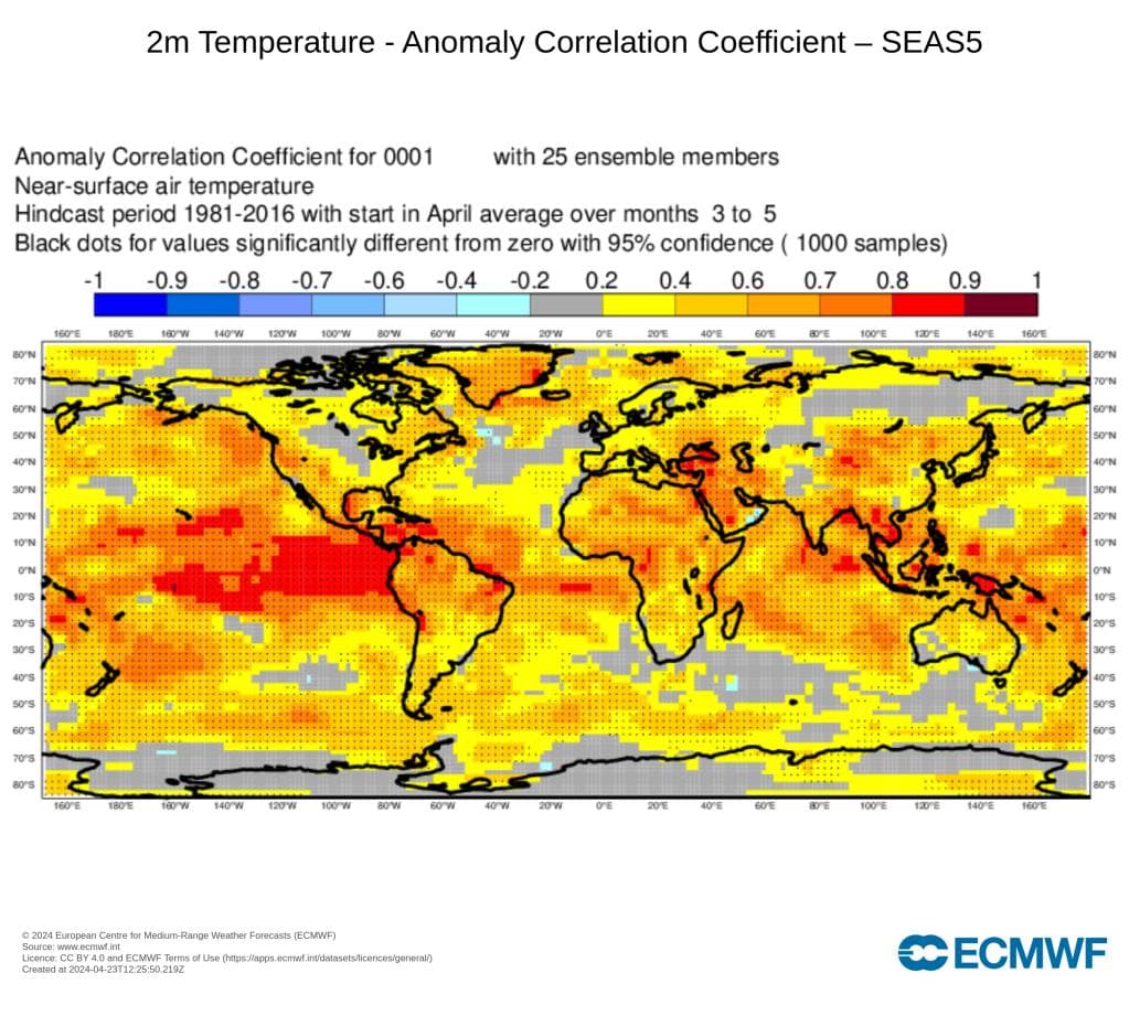 Det er kun de punktene som er markert med prikker, som er treffsikre, riktignok i henhold til ganske strenge kriterier. Men uansett: varslene for Norge har ingen signifikant treffsikkerhet. Derfor velger vi å vente til mai med å publisere våre sommervarsler. I mellomtiden kan du selv se på eksisterende varsler fra ECMWF her.