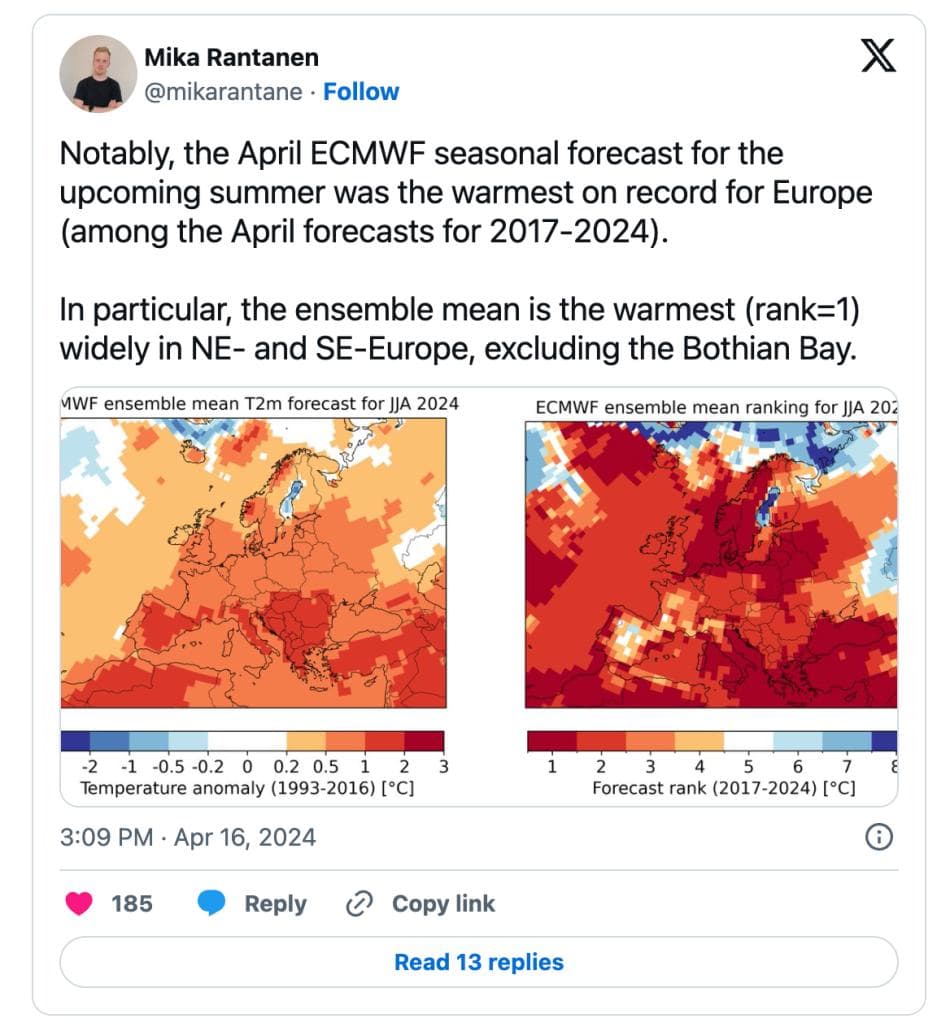 Men hva er det egentlig Rantanen viser her? Jo, han har brukt sommervarslene (juni, juli og august) fra ECMWF for årene 2017-2024. I hvert av disse årene ble det produsert 51 slike sommervarsler i april, og han har regnet ut gjennomsnittet av disse 51 varslene for hver sommer. Så har han rangert disse gjennomsnittlige varslene etter temperatur, og på bildet til høyre viser han hvilken plass 2024 kom på i denne rangeringen. De rødeste fargene indikerer hvor 2024 kom på førsteplass av de åtte somrene som ble sammenlignet.