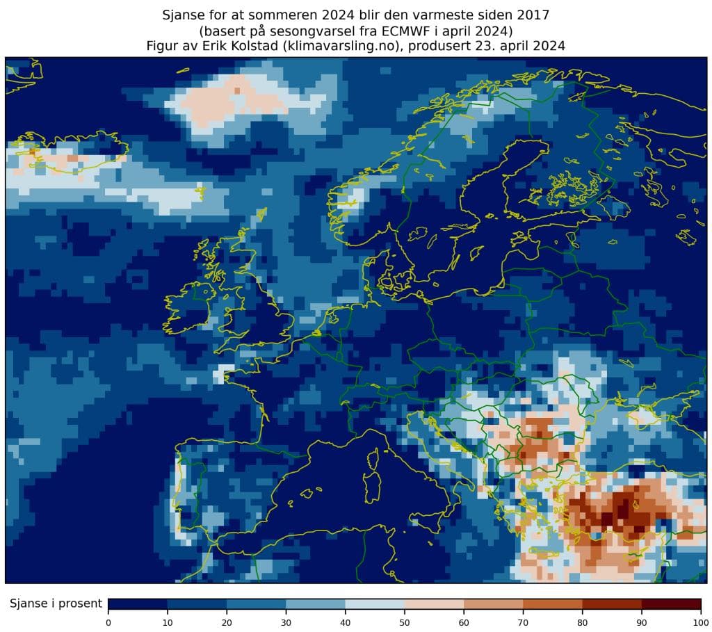 I det meste av området som er vist, er det langt under 50 prosent sjanse for at 2024 skal bli «rekordvarm» (altså varmere enn alle somrene i perioden 2017–2023). Riktignok er det opptil 40 prosent sjanse noen steder i Norge, men det er etter min mening vanskelig å tolke disse sannsynlighetene i den retningen VG og Dagbladet har gjort det.